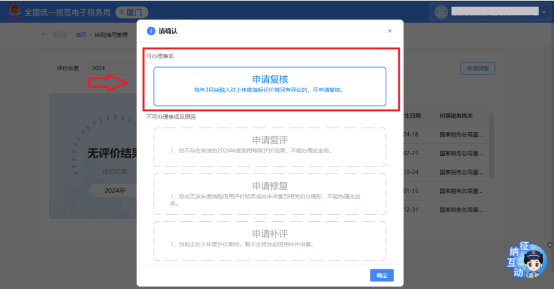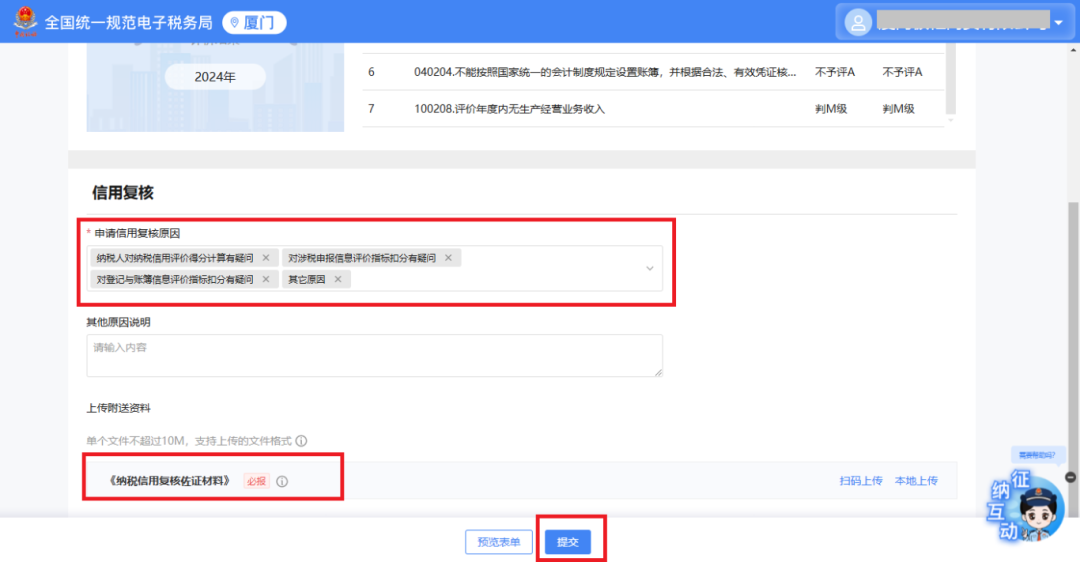 点击右上角【申请调整】,在弹出的确认框中选择【申请复核】,根据实际情况选择申请信用复核原因,并上传纳税信用复核佐证资料,点击【提交】。