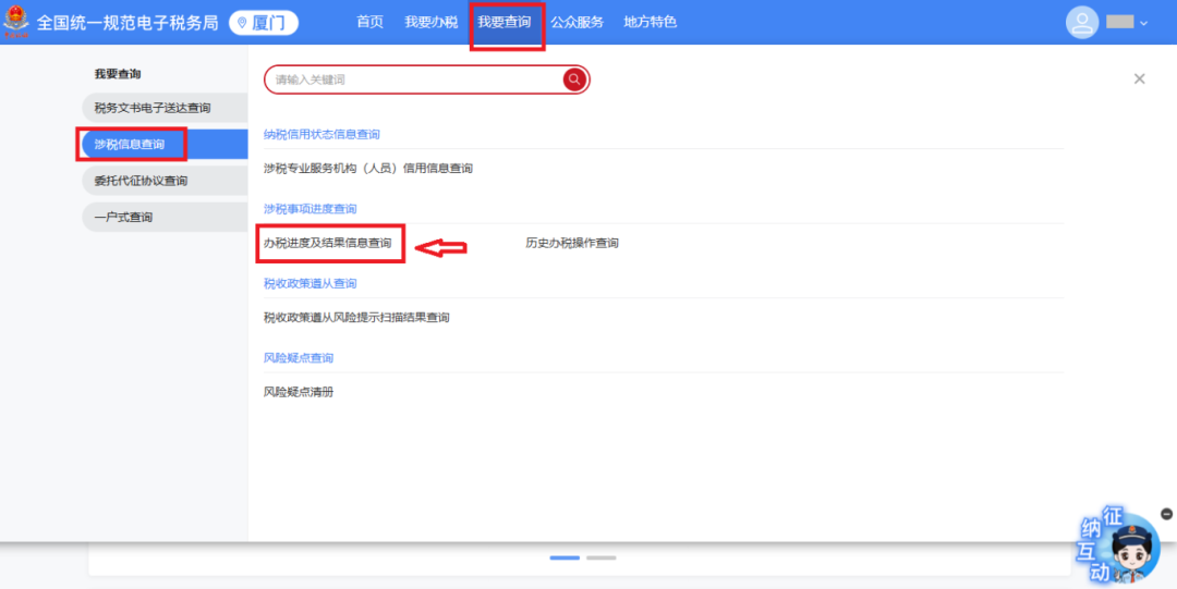 可以在【我要查询】-【涉税信息查询】-【办税进度及结果信息查询】查看办理进度。