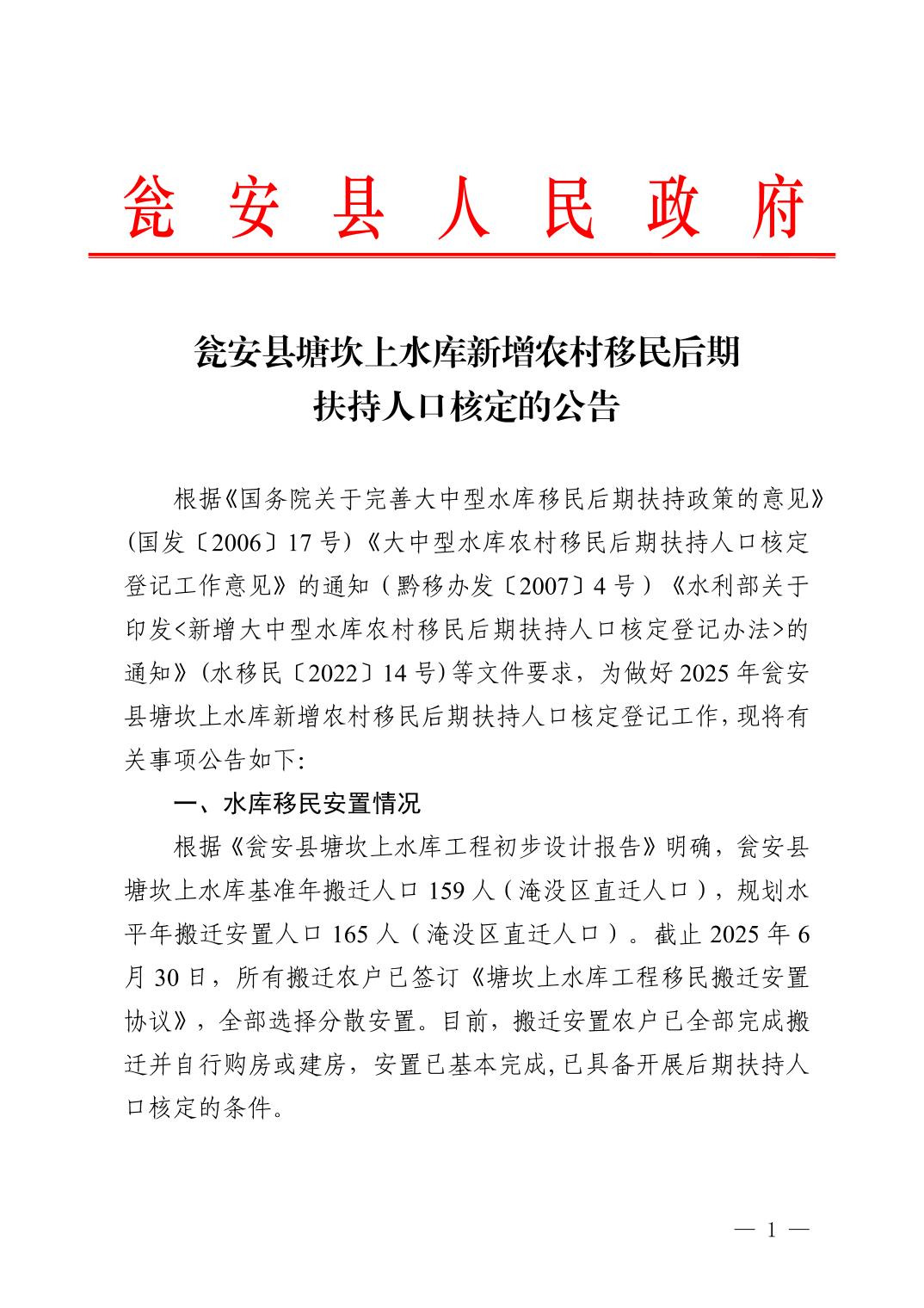 瓮安县塘坎上水库新增农村移民后期扶持人口核定的公告