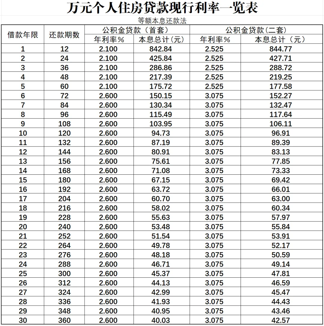 万元个人住房贷款现行利率一览表