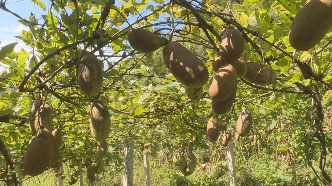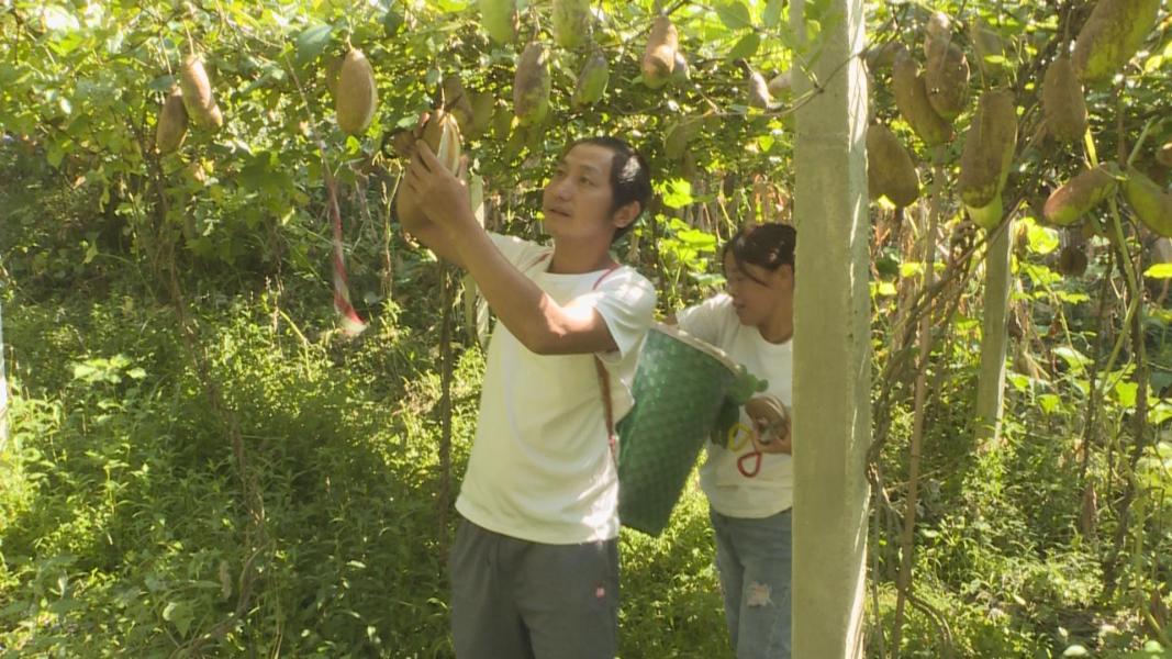 “八月瓜,九月炸,十月摘来诓娃娃。”当前正是八月瓜成熟的季节,在江界河镇茶园村村民马军的八月瓜种植基地里,翠绿的枝叶和藤蔓交织在一起,藤蔓上挂着一个个青色、紫色的果实,部分成熟的果实果皮绽开,露出白色的果肉,散发着诱人的香味。马军和妻子正手拿剪刀、篮子等工具在果林之间穿梭,将成熟的八月瓜采摘下来,准备售卖。